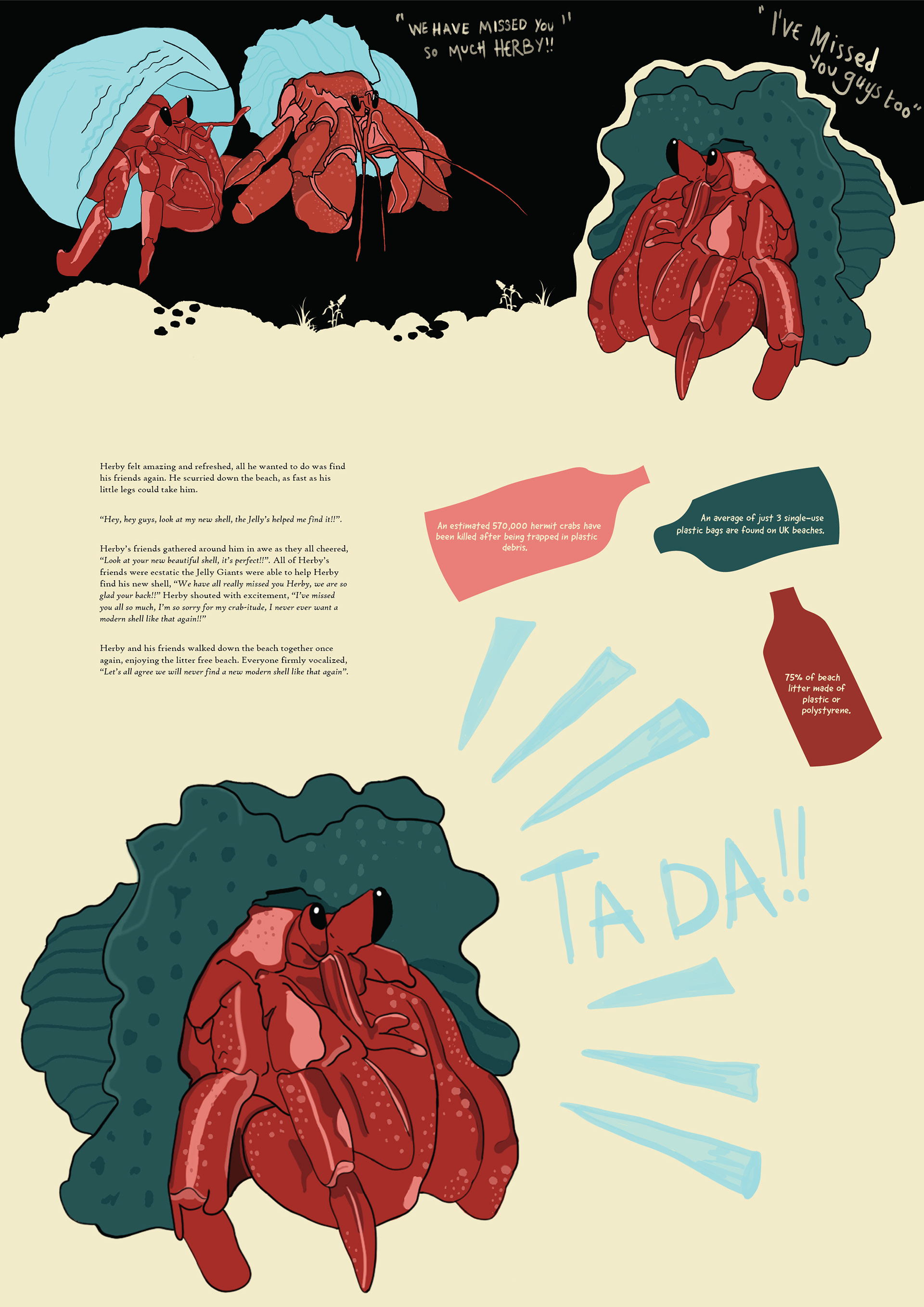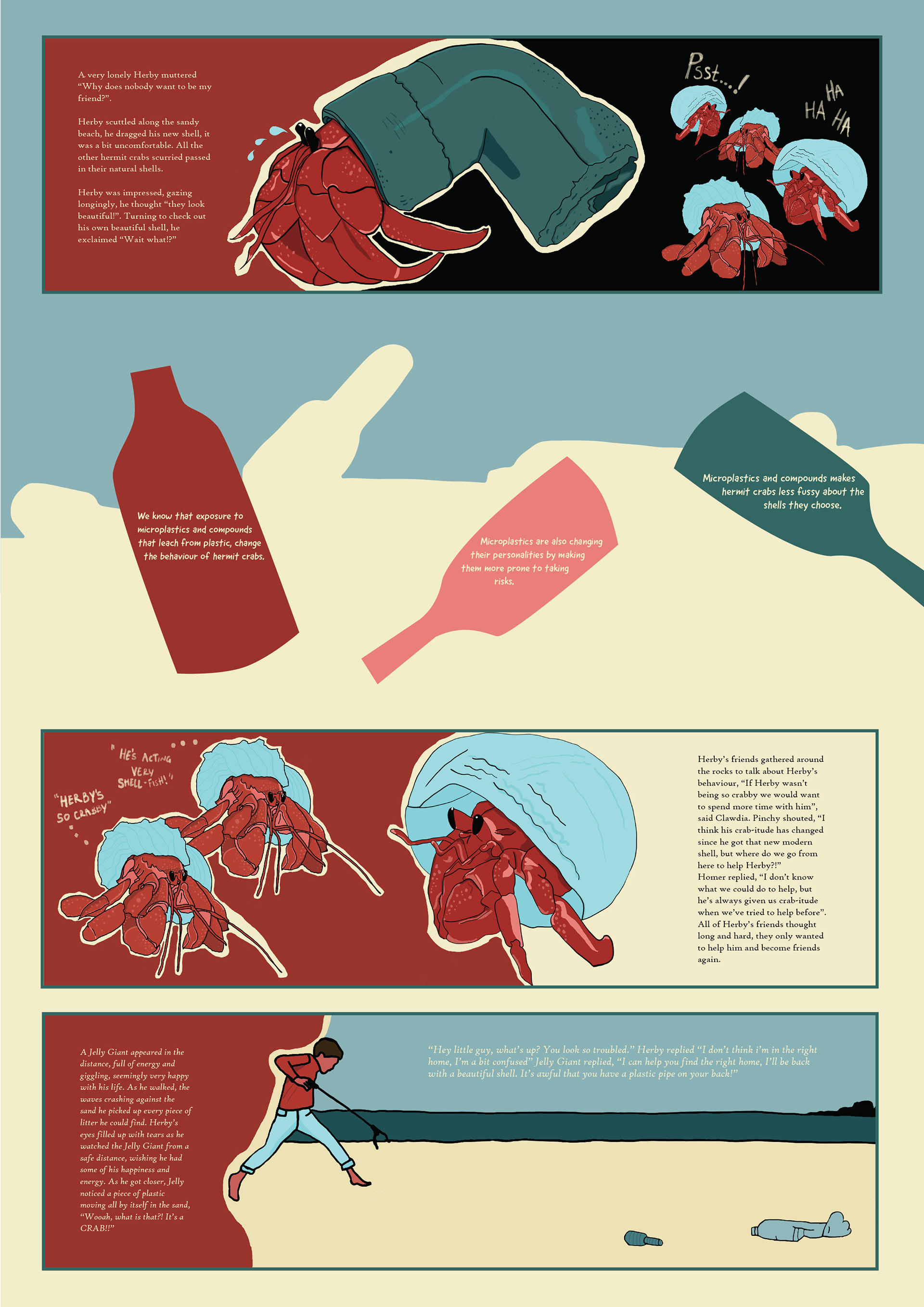 The story focuses on Herby, a hermit crab trapped in a plastic shell, feeling lonely and rejected by his peers. Through three scenes, the narrative shows Herby’s journey from isolation and misunderstanding to hope and transformation and finally reconciliation and renewed friendship. The characters’ dialogue reveals Herby’s inner struggle and highlights the broader message about plastic pollution affecting marine life.