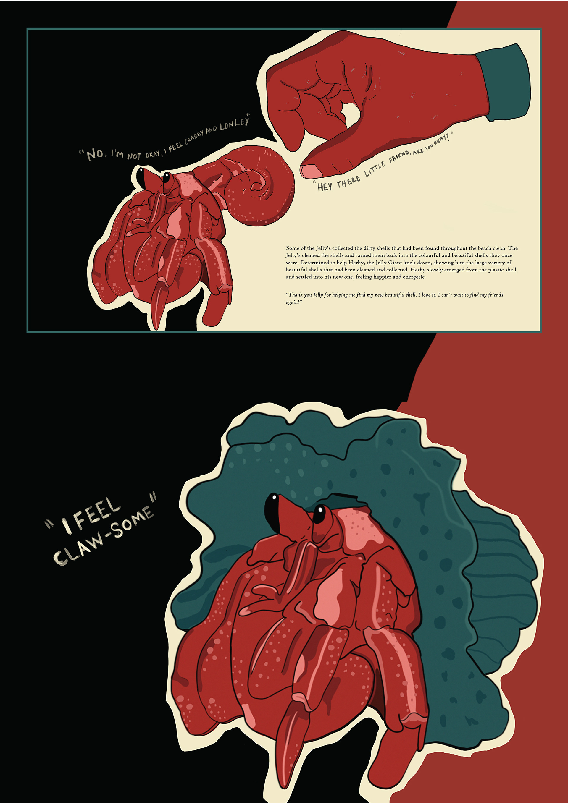 Overall, this project was very rewarding. It pushed me to develop my storytelling skills while improving my technical abilities with design software. More importantly, it confirmed my belief in the power of stories to create social and environmental change. Herby’s story is not just about a crab. It’s a reminder of how our choices affect the natural world.